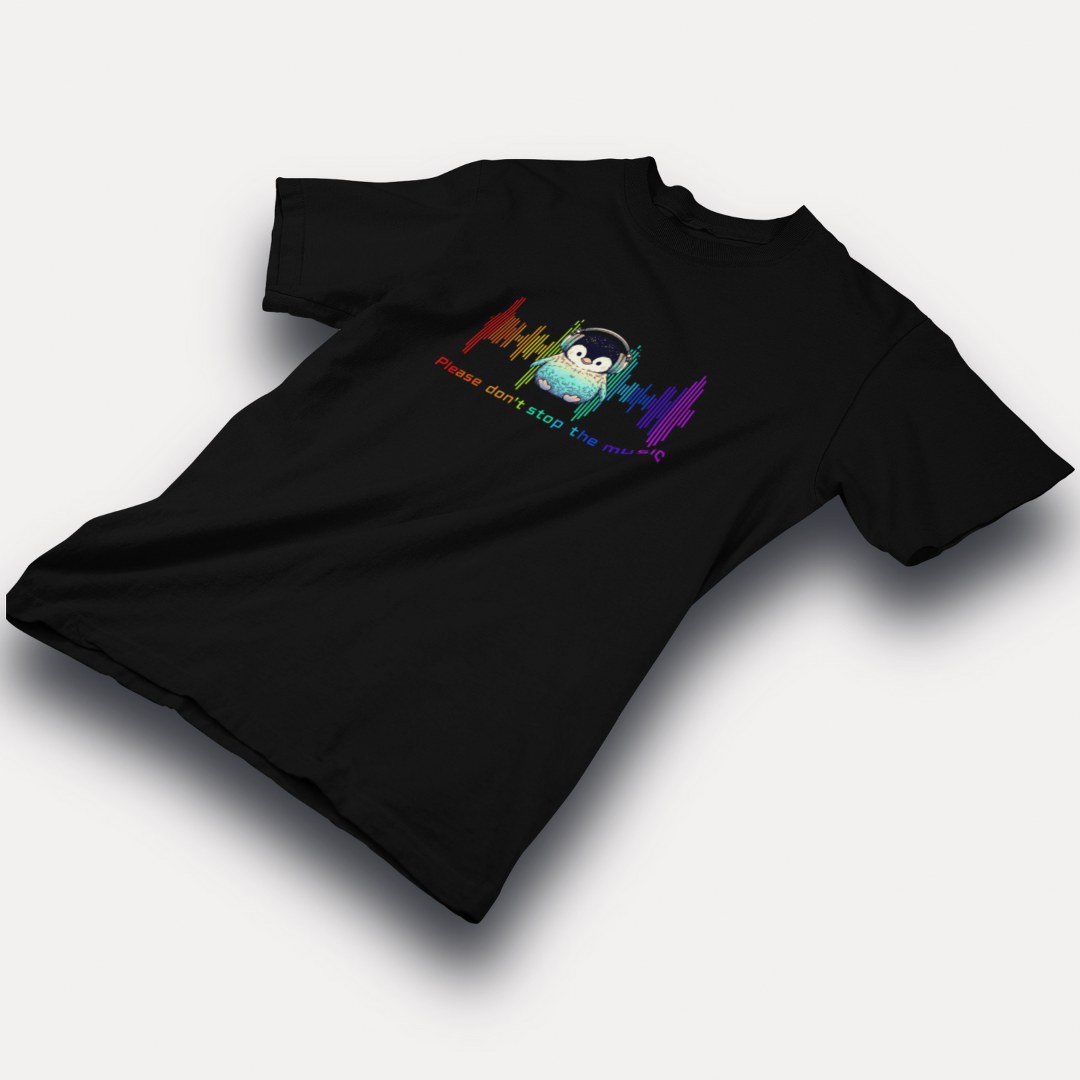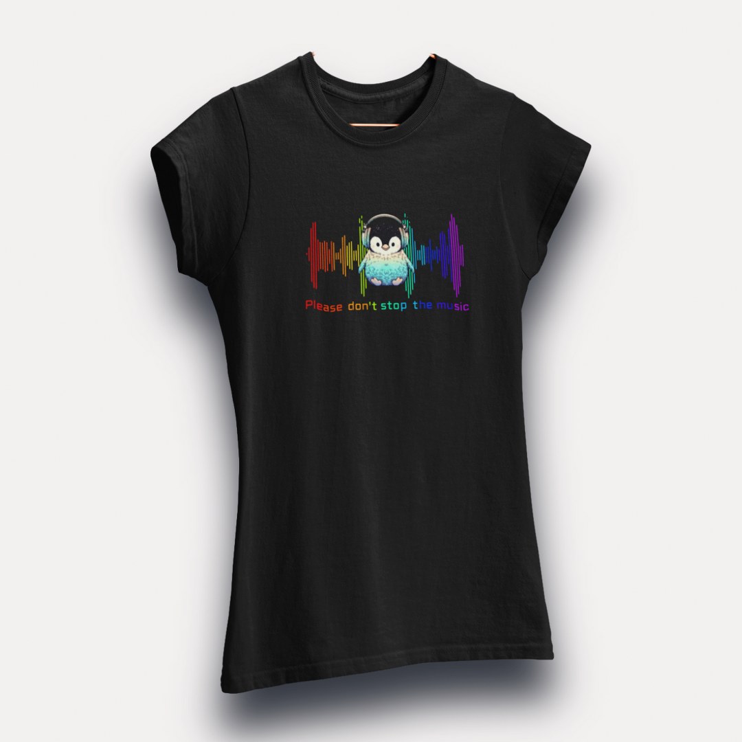 Damen T-Shirt Slim – Please don’t stop the music – Lustiges Motiv mit Pinguin & Kopfhörern – Geschenkidee Musikliebhaber.