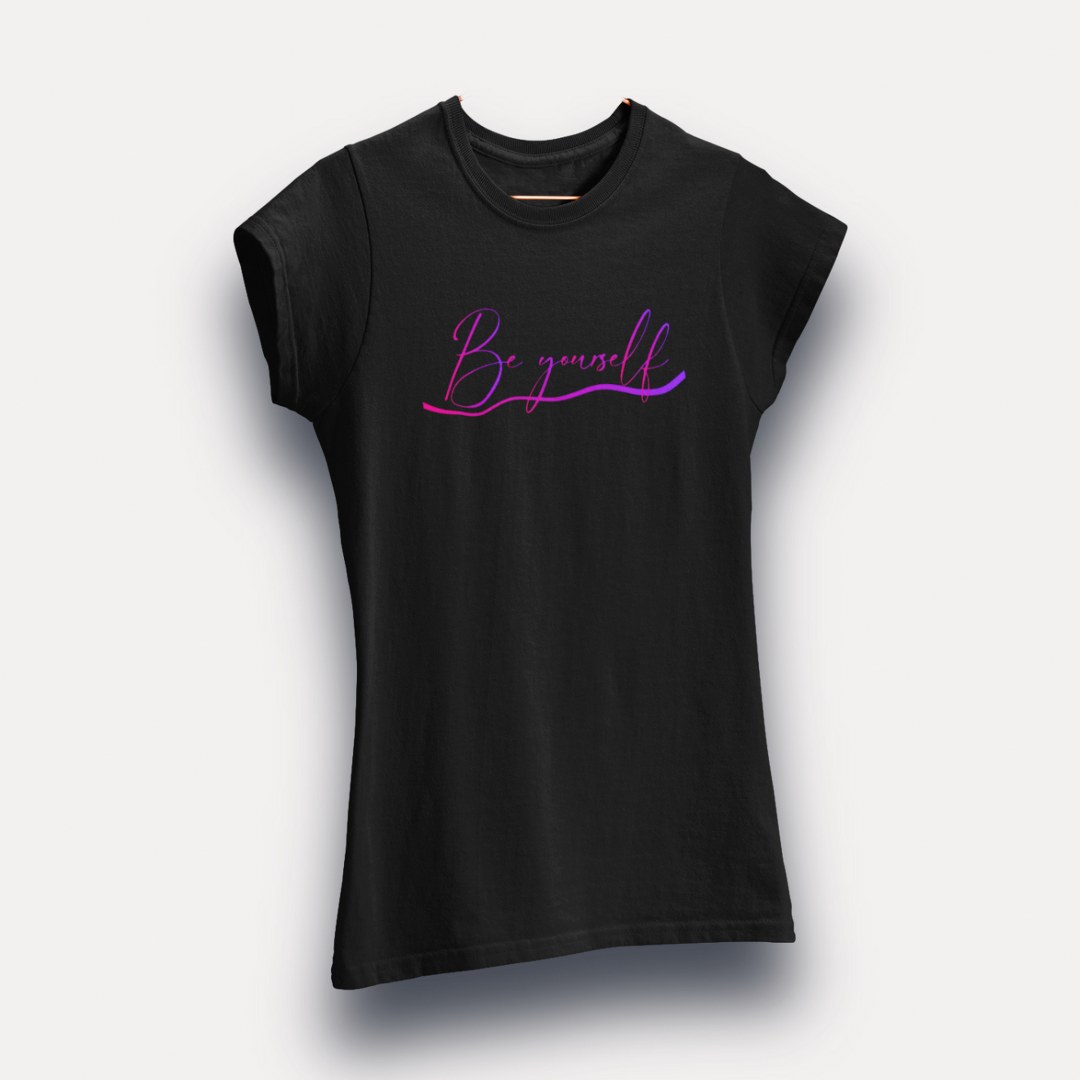 Damen-T-Shirt „Be yourself“ – schwarzes Slim-Fit-Shirt mit pink-lila Schriftzug – Motivationsshirt mit Stil