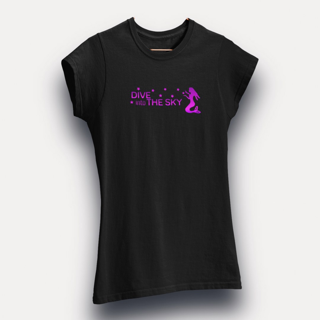 Damen-T-Shirt „Dive into the Sky“ – schwarzes Slim-Fit-Shirt mit pinkem Motiv – inspirierendes Shirt mit Sternen und Meerjungfrau