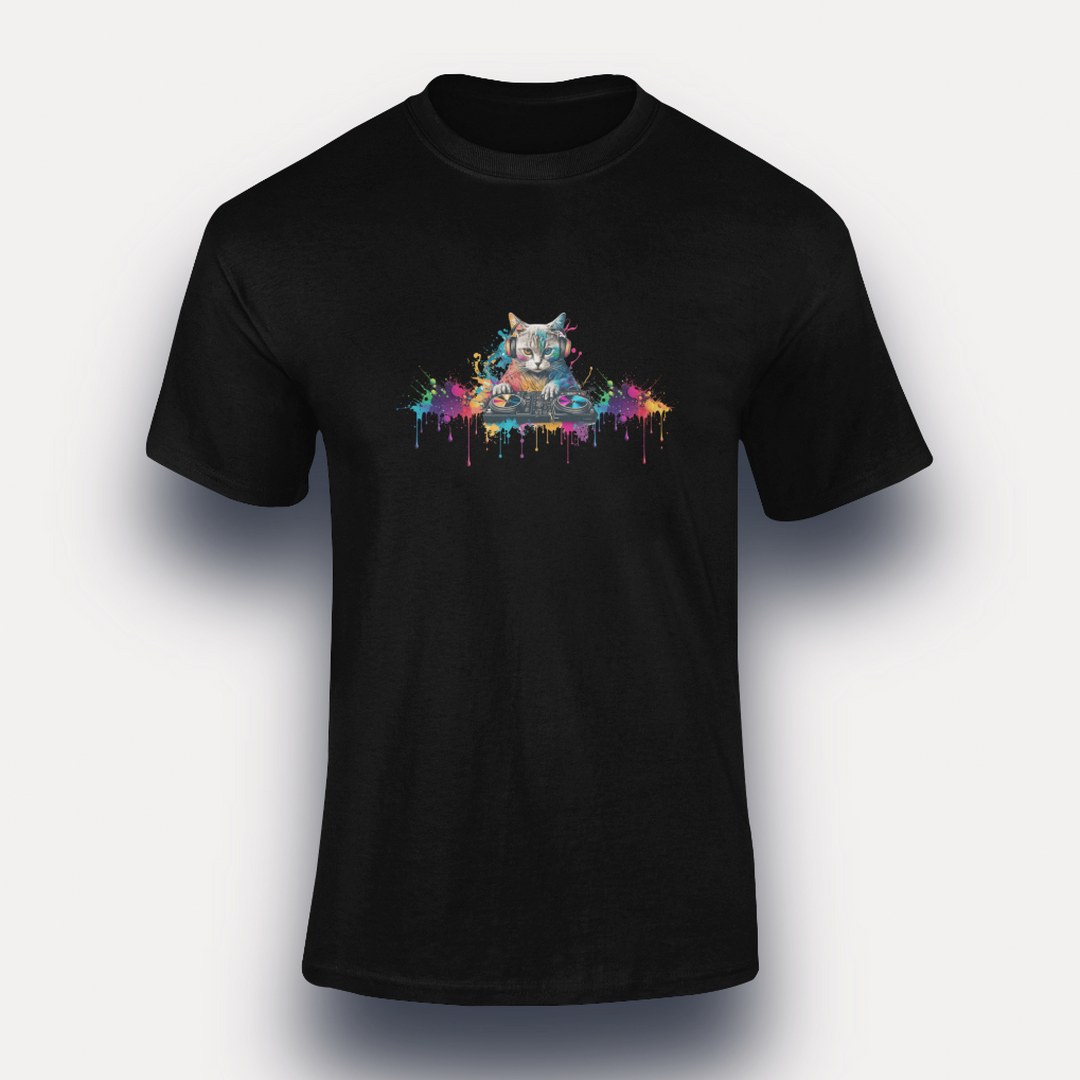 Schwarzes Herren T-Shirt – Bunte Katze mit Kopfhörern – Kreatives Design – OEKO-TEX zertifiziert