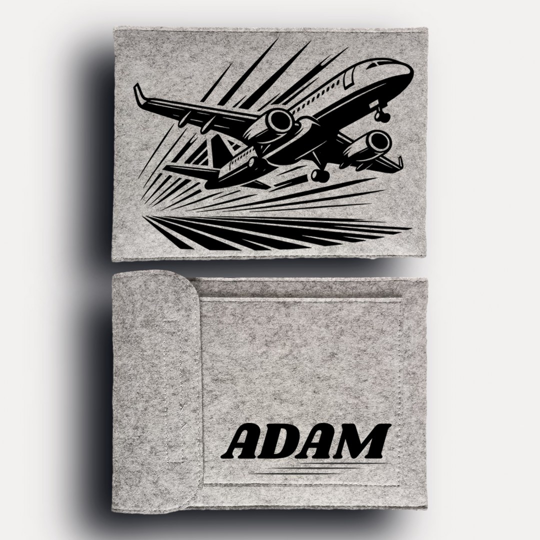 Filz Tablet-Etui mit Flugzeug – personalisierbar mit Namen – Geschenkidee für Reisefans