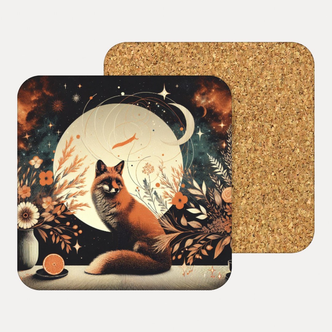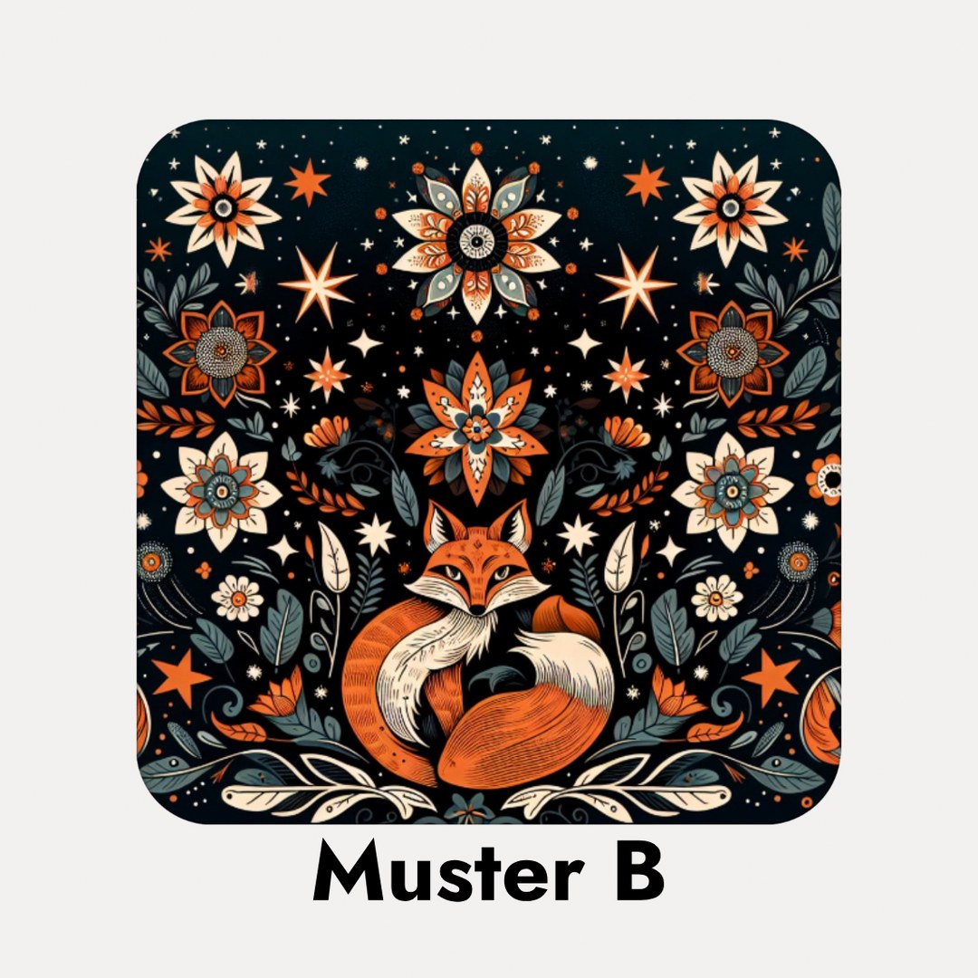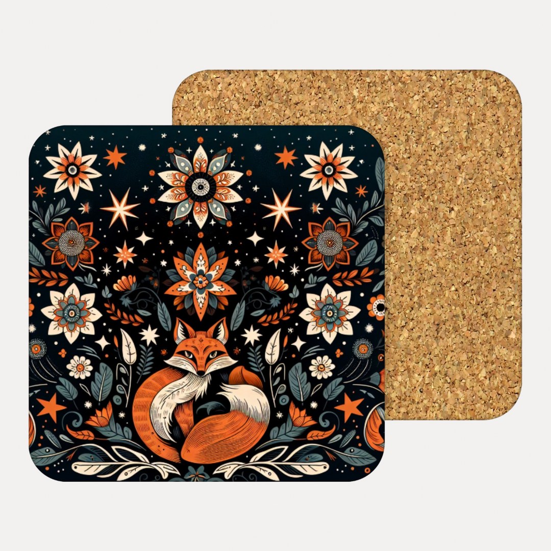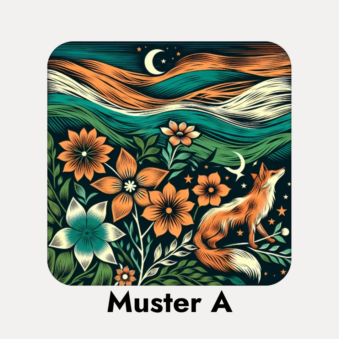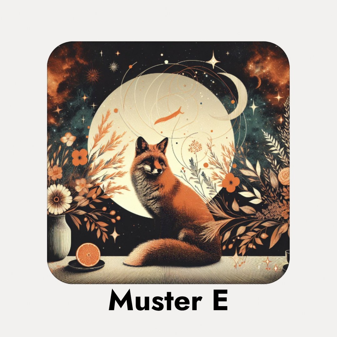Diese quadratischen Korkuntersetzer mit traumhaften Fuchs- und Blumenmotiven vereinen Natur, Farbe und Gemütlichkeit in einem harmonischen Design.