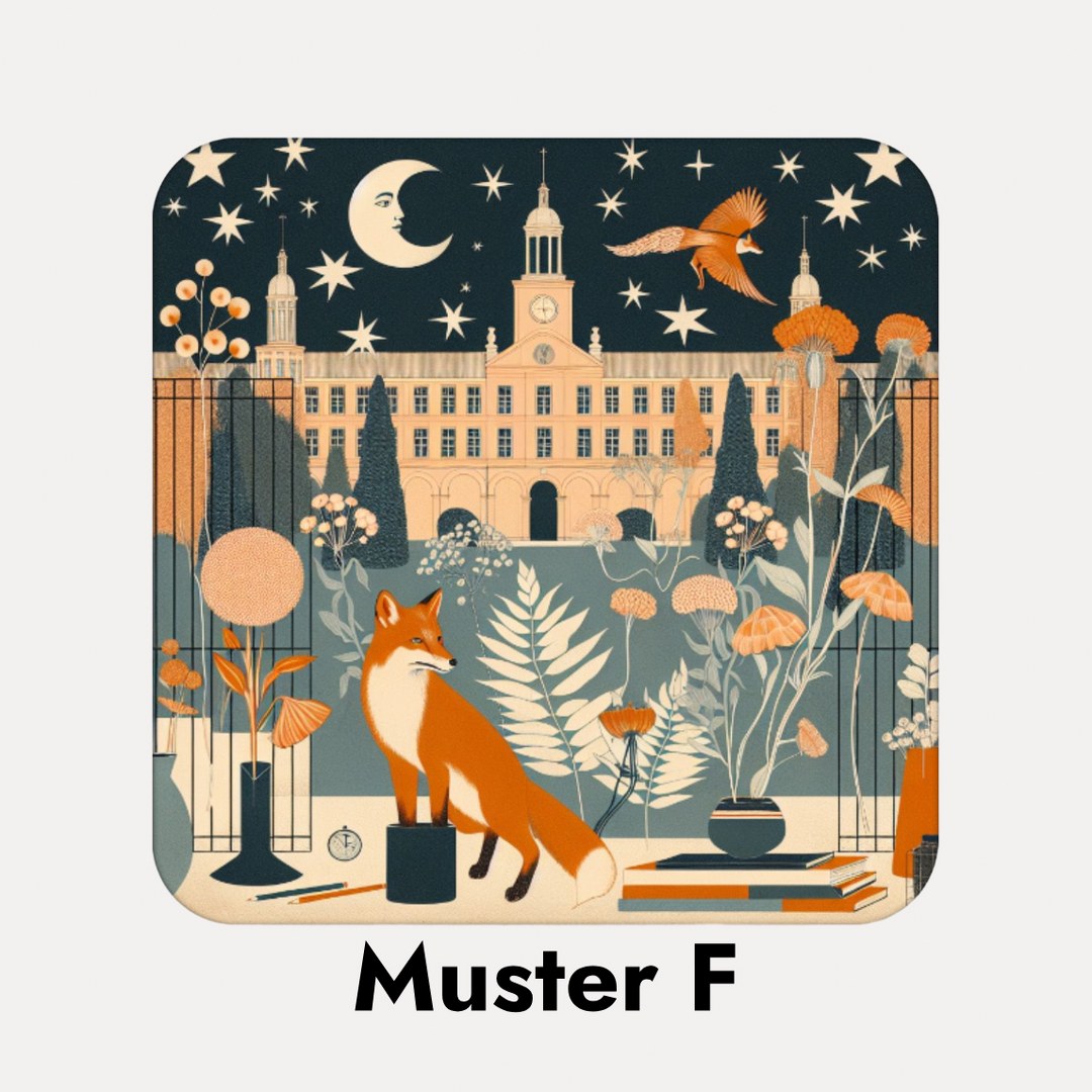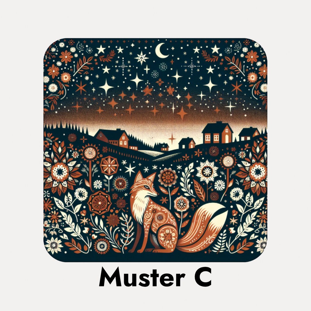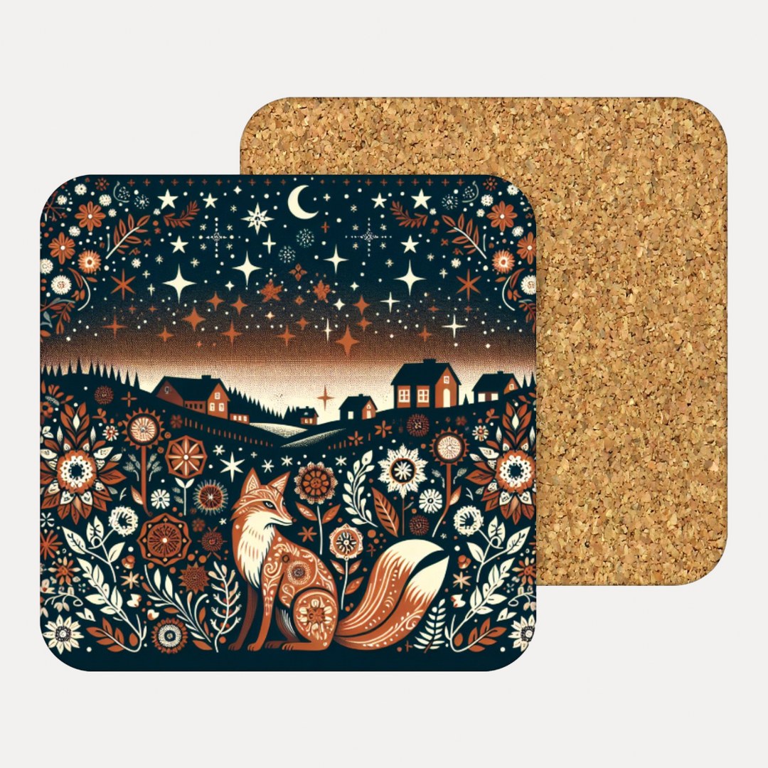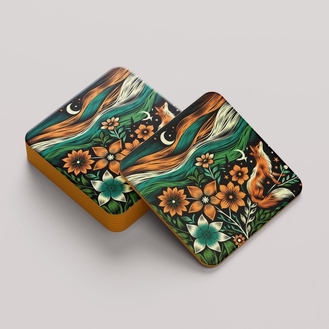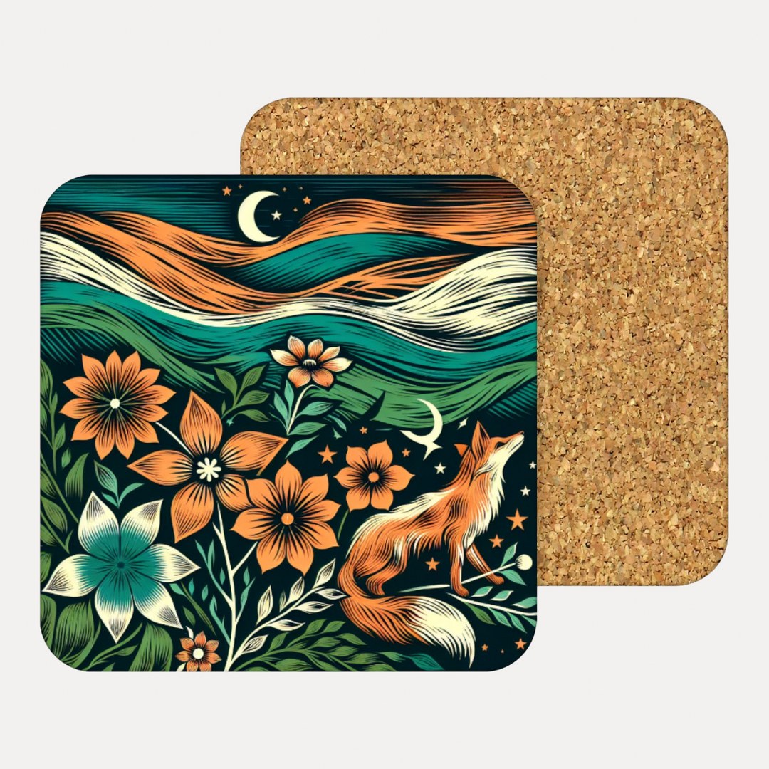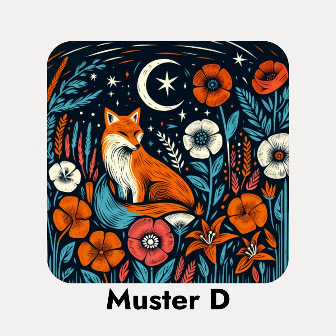 Diese quadratischen Korkuntersetzer mit traumhaften Fuchs- und Blumenmotiven vereinen Natur, Farbe und Gemütlichkeit in einem harmonischen Design.