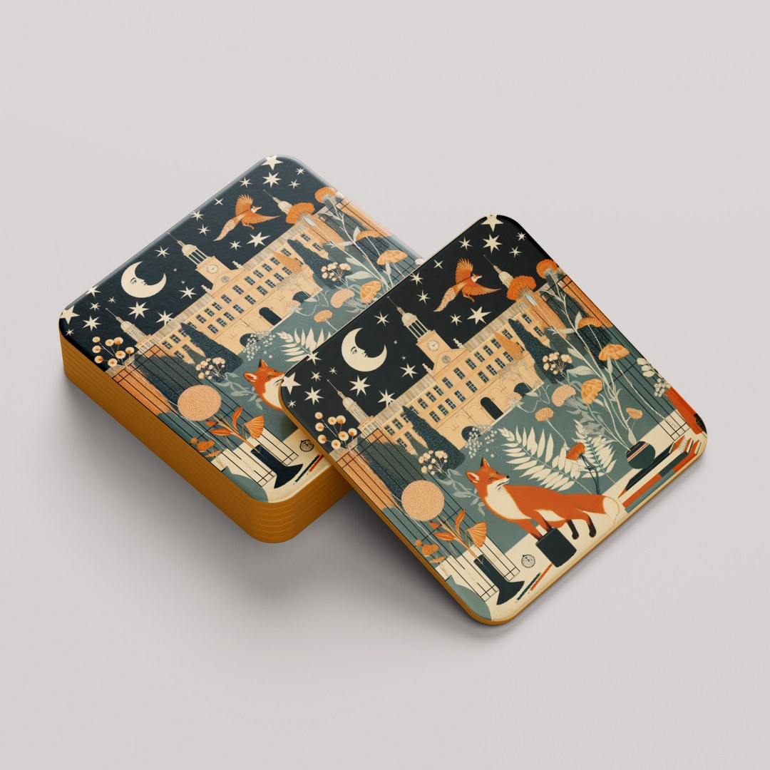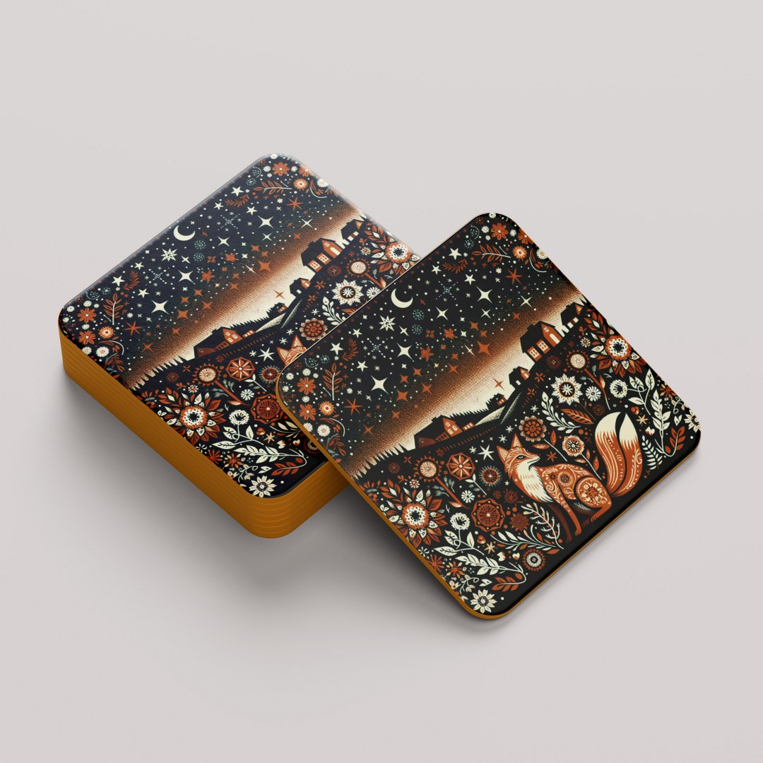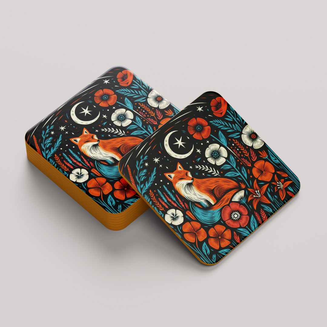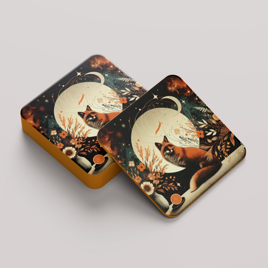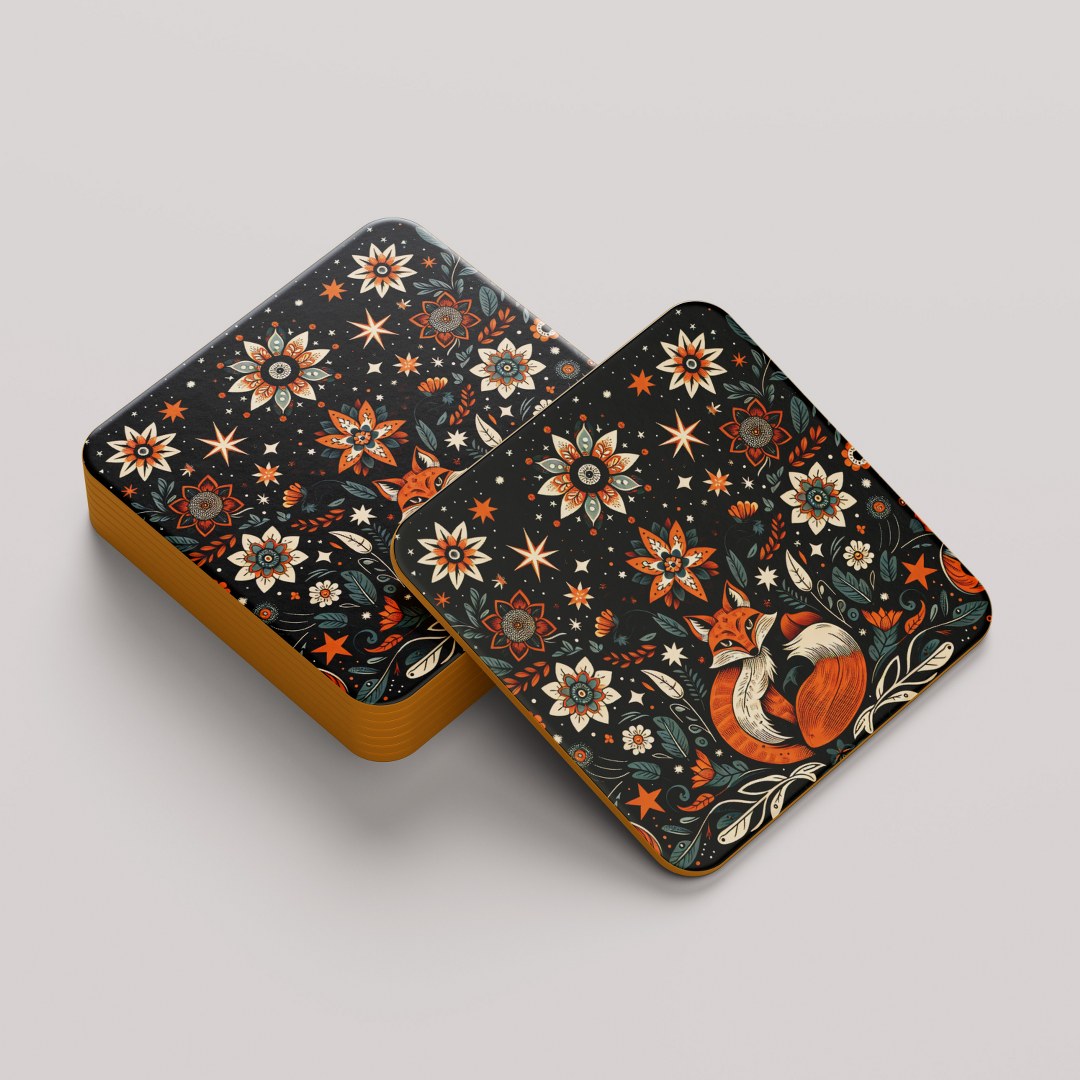 Diese quadratischen Korkuntersetzer mit traumhaften Fuchs- und Blumenmotiven vereinen Natur, Farbe und Gemütlichkeit in einem harmonischen Design.