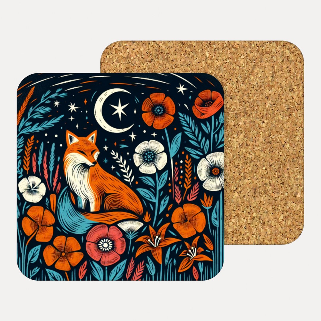 Korkuntersetzer – Fuchs & Blumen – Quadratisch – Wählen Sie Ihr Set (1–6 Stück) – Stilvoll & Hitzebeständig