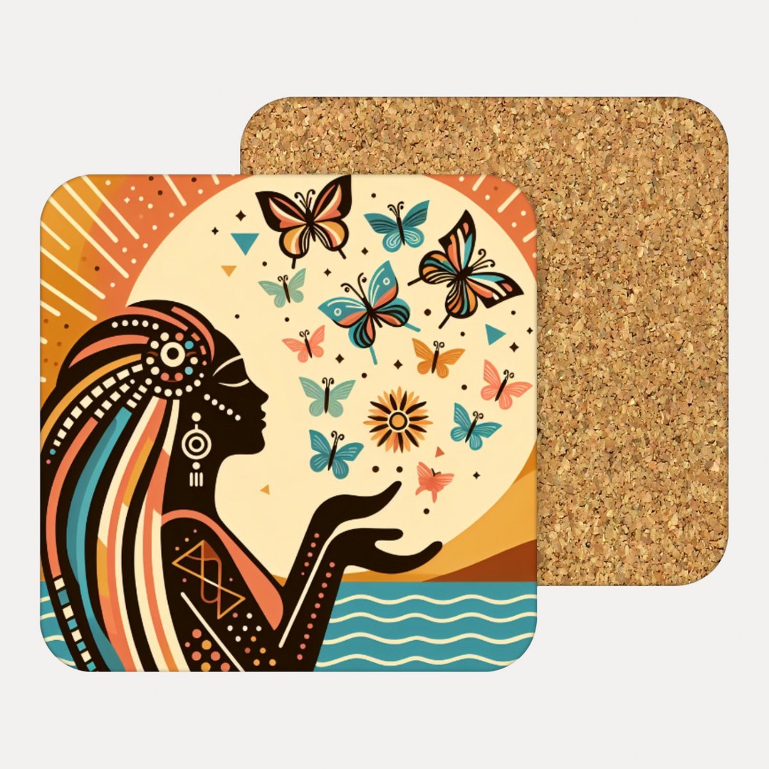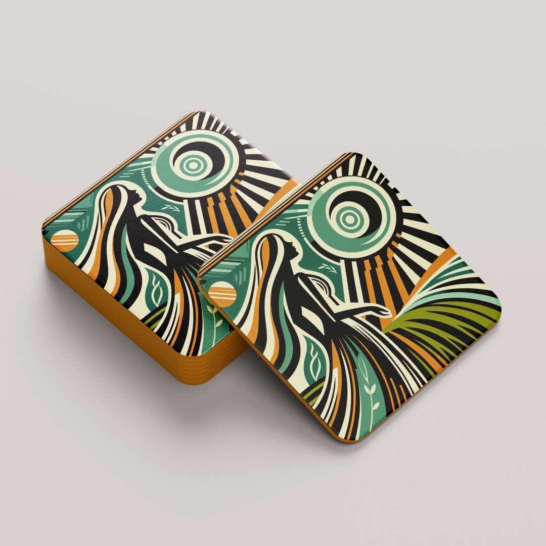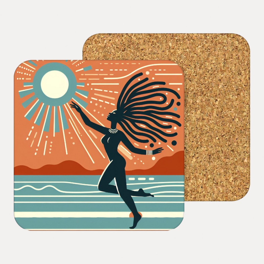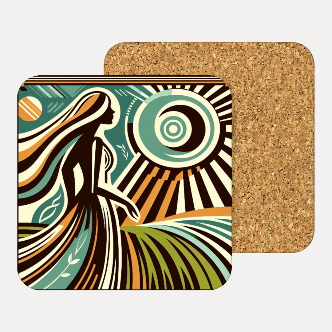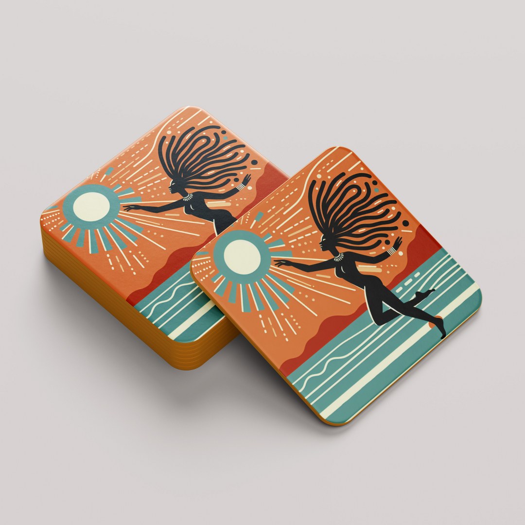 Diese quadratischen Korkuntersetzer mit ausdrucksstarken Frauensilhouetten und Sonnenmotiven vereinen Ästhetik, Kraft und Lebensfreude.