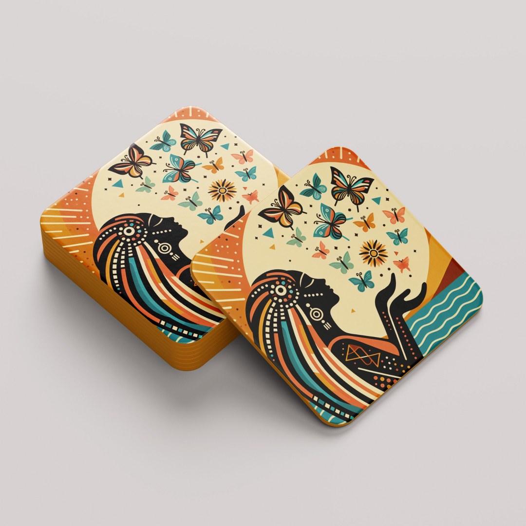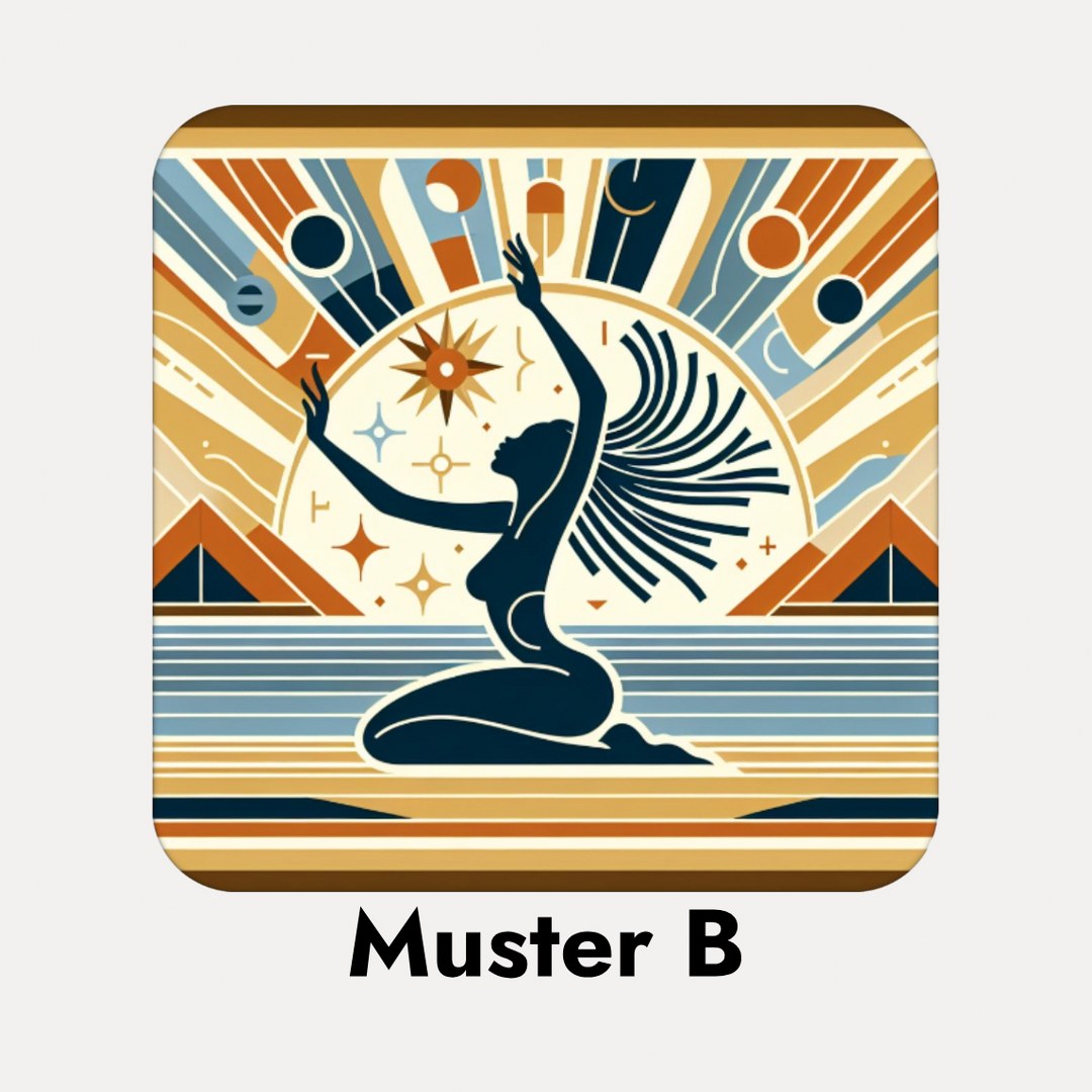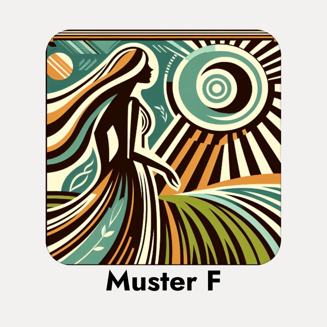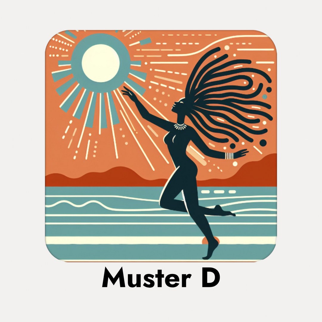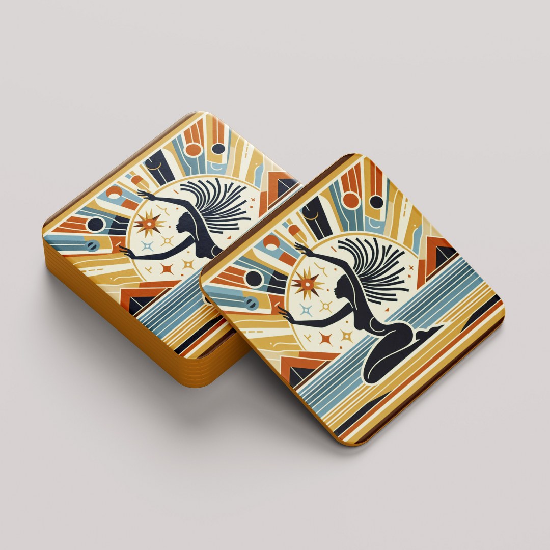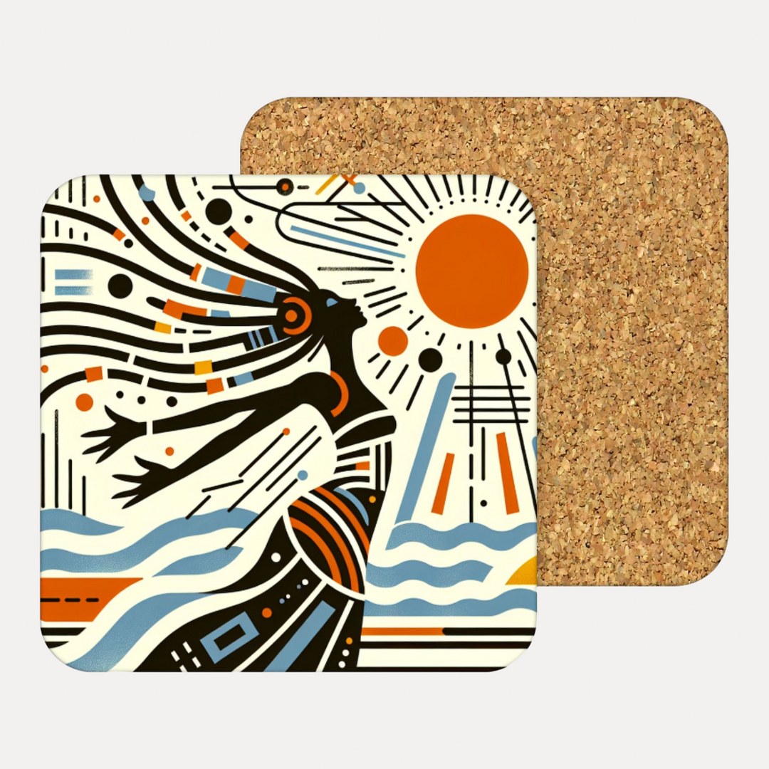 Diese quadratischen Korkuntersetzer mit ausdrucksstarken Frauensilhouetten und Sonnenmotiven vereinen Ästhetik, Kraft und Lebensfreude.