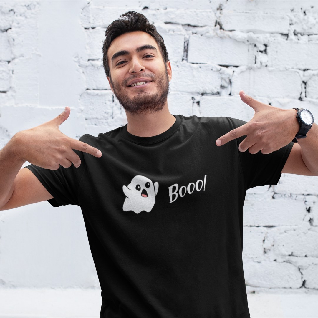 Dieses schwarze Herren-T-Shirt bringt mit seinem süßen Geist und dem Schriftzug „Booo!“ humorvolle Halloween-Stimmung in den Alltag.