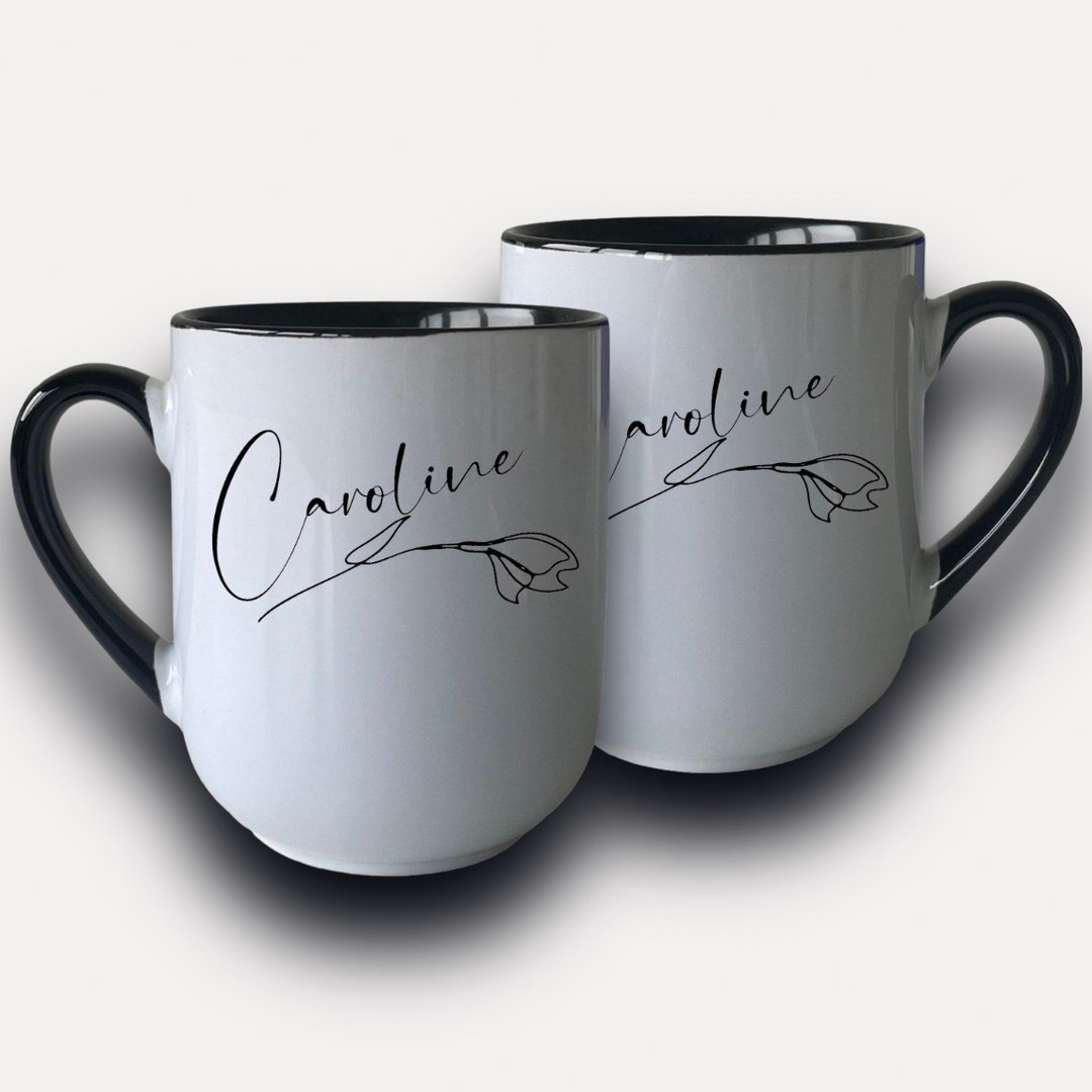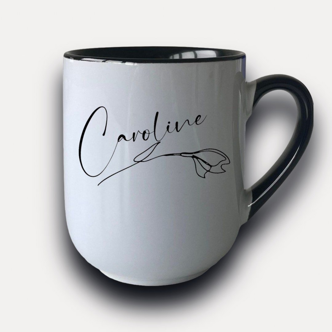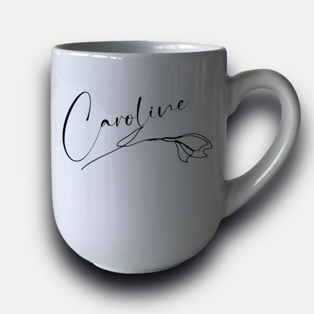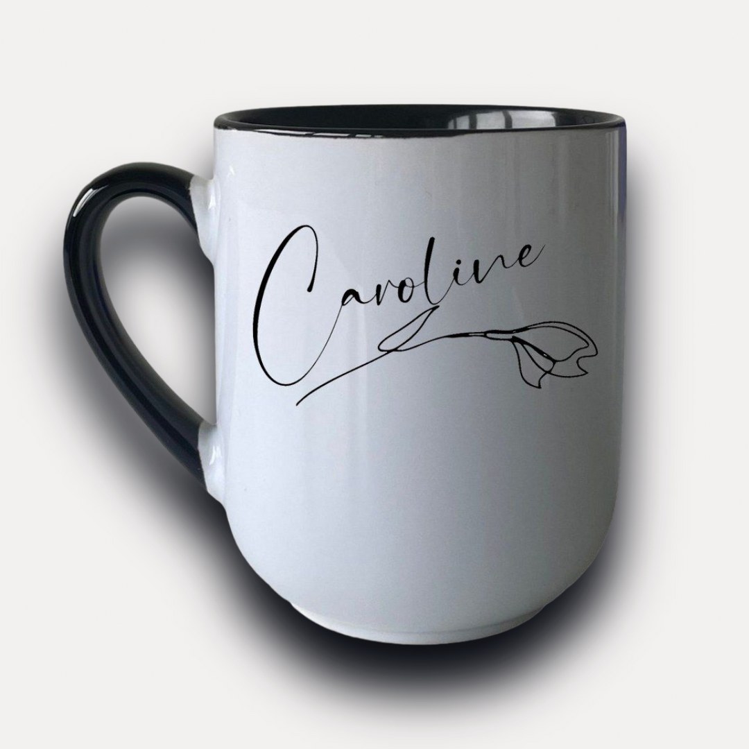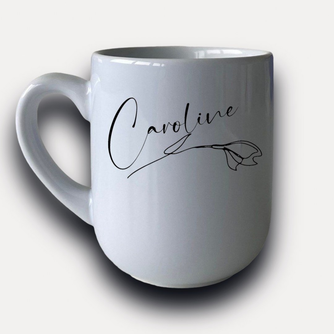 Entdecken Sie die perfekte Kombination aus Eleganz und Funktionalität mit unserer personalisierten Tasse mit Namen und zartem Blumenmotiv.